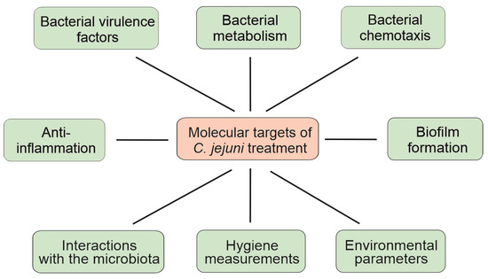 Overview of the molecular targets in C. jejuni treatment strategies. For more details, see text.