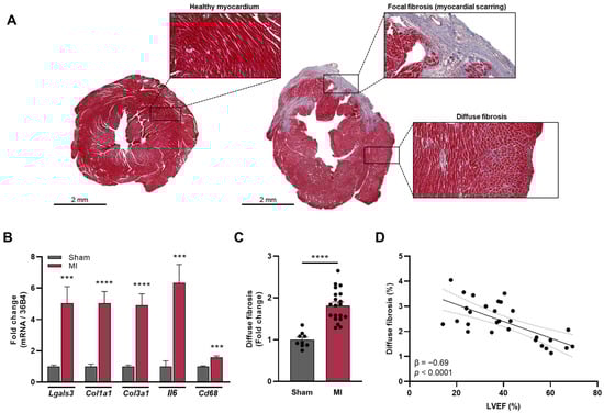 (A) Representative images of Masson’s trichrome-stained cardiac tissue sections of C57Bl/6J background mice 6 weeks post-MI, and their sham-operated counterparts. The image details represent a healthy myocardium, focal fibrosis and diffuse fibrosis. (B) Cardiac gene expression of genes involved in fibrosis and immune infiltration in sham-operated mice (n = 9) and mice 6 weeks post-MI (n = 20), depicted as fold change compared to sham. (C) Percentage of diffuse fibrosis of the non-infarcted myocardium in sham-operated mice (n = 9) and mice 6 weeks post-MI (n = 20), quantified from Masson’s trichrome-stained images and depicted as fold change compared to sham. (D) Association between diffuse fibrosis and cardiac function. *** p < 0.001, **** p < 0.0001. Cd68, cluster of differentiation 68; Col1a1, collagen type I alpha I chain; Col3a1, collagen type III alpha I chain; Il6, interleukin-6; Lgals3, galectin-3; MI, myocardial infarction.