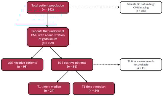 Subsequently, LGE-positive patients were stratified based upon diffuse fibrosis of the non-LGE myocardium (above or below median post-contrast T1 time; the median T1 time was 382 ms, n = 24 in both groups). For the patient selection flow chart, see Figure 2. In both groups, the majority (n = 18, 75% in both) of patients showed a subendocardial or transmural LGE pattern, reflecting myocardial ischemia. Patients with shorter post-contrast T1 time showed higher levels of both NT-proBNP (1611 ng/L vs. 453 ng/L, p = 0.009) and galectin-3 (20.3 µg/L vs. 14.5 µg/L, p = 0.011) (Figure 3, Table 2), without differences in LVEF (33 [23–40] vs. 36 [30–45], p = 0.10) or cardiac dimensions (e.g., LVEDV and LVESV) between both groups.