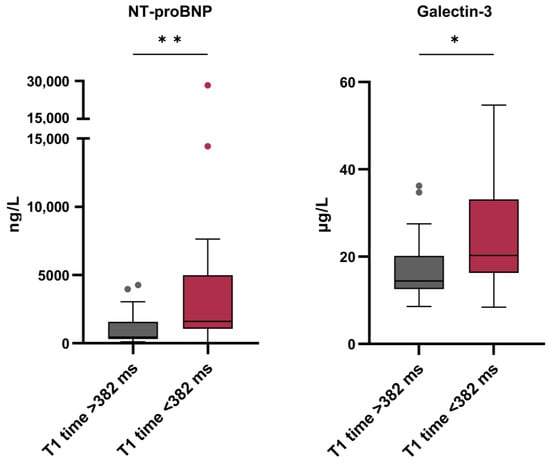 Biomarker levels of NT-proBNP and galectin-3 in LGE-positive patients stratified based upon median post-contrast T1 time of the non-infarcted myocardium. * p < 0.05, ** p < 0.01.