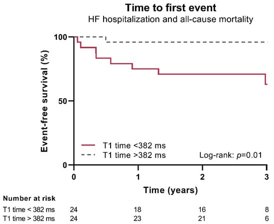 In LGE-positive patients, HF hospitalization and all-cause mortality were reached in 9 (43%) patients with a shorter post-contrast T1 time, compared to 3 (14%) patients with a longer T1 time during follow-up. Those patients with a shorter post-contrast T1 time had a worse prognosis regarding HF hospitalizations and all-cause mortality compared to those with a longer T1 time (log-rank p = 0.01, Figure 4), mainly due to higher HF hospitalization rates (log-rank p = 0.02) rather than death of any cause (log-rank p = 0.16). In univariable Cox regression analyses, patients with a shorter T1 time showed a higher risk of HF hospitalization and all-cause mortality (HR 1.09 [1.02–1.18] per 10 milliseconds decrease in T1 time, p = 0.013). Due to a small number of events, no multivariable regression analysis was performed.