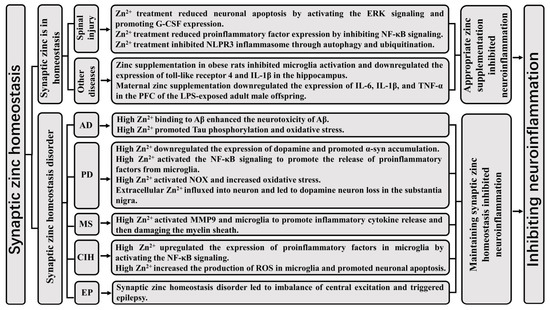 Relationship between synaptic zinc and neuroinflammation. Zinc is an indispensable trace element for maintaining life-preserving activities of organisms. When synaptic zinc is in homeostasis, the appropriate zinc supplementation enhances the body’s utilization of zinc, thereby enhancing the body’s ability to resist neuroinflammation. However, synaptic zinc disorder further damages the synaptic function when suffering from synapse damage-related diseases. Zn2+ uptake in vitro and the large amount of Zn2+ released by impaired synapses promote neuroinflammation, so maintaining synaptic zinc homeostasis inhibits neuroinflammation. ERK (extracellular signal-regulated kinase); granulocyte colony stimulating factor (G-CSF); nuclear factor-κB (NF-κB); NOD-like receptor protein 3 (NLRP3); interleukin (IL); tumor necrosis factor-α (TNF-α); prefrontal cortex (PFC); lipopolysaccharide (LPS); Alzheimer’s disease (AD); Parkinson’s disease (PD); multiple sclerosis (MS); cerebral ischemia and hypoxia (CIH); epilepsy (EP); β-amyloid (Aβ); α-synuclein (α-syn); reduced nicotinamide adenine dinucleotide phosphate oxidase (NOX); matrix metalloproteinase (MMP); reactive oxygen species (ROS).