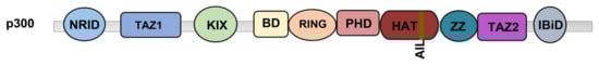 p300 was first discovered in 1986 and is a protein with a molecular weight of 300 kDa. p300 is also the nuclear binding target of the adenovirus E1A cancer protein. It has high structural homology with CBP, with an approximately 70% homologous sequence. CBP is an important protein that can bind to cAMP reaction element binding protein (CREB). p300 and CBP have similar but different functions; for example, p300 is mainly involved in transcription and mediates posttranslational modification, while CBP mainly plays a role in cell transformation. The p300 structural domain mainly includes the N-terminal nuclear receptor interaction domain (NRID), transcription adapter zinc finger 1 (TAZ1) and the kinase-induced CREB interaction (KIX) domain [29,30]. The HAT domain is very important for the formation of the transcription complex. Furthermore, it also contains a bromine domain (BD): this domain is the key to the auxiliary transcription function and is involved in the interaction of acetylated modified proteins and the regulation of different physiological and pathological processes; it is also involved in the interaction of the RING domain with the plant homologous domain (PHD), which leads to interactions with the ZZ-type zinc finger domain, TAZ2 domain and IBiD domain [31,32,33], as shown in Figure 1.