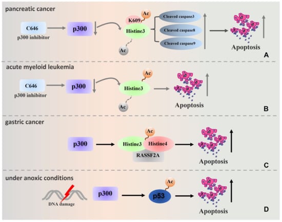 Schematic representation of pathways involved in the regulation of apoptosis by p300. (A) In pancreatic cancer studies, C646 treatment was followed by interference with p300 followed by inhibition of acetylation of H3K27, leading to increased expression of apoptosis-related proteins such as cleaved caspase 3, 8 and 9 and promoting cell apoptosis. (B) C646 treatment leads to apoptosis in AML1-ETO positive AML cell line and primary parental cells, which may be associated with p300-mediated histone acetylation. (C) p300 is involved in the acetylation of the Histones H3 and H4 on RASSF2A promoter and regulates the expression of RASSF2A, thus inducing apoptosis of gastric cancer cells. (D) p300 acetylates p53 and regulates apoptosis in the presence of hypoxia or DNA damage (Remarks: The grey arrow is the related process in which p300 inhibitors participate in regulation, and the dotted line is the process in which modification types are removed).