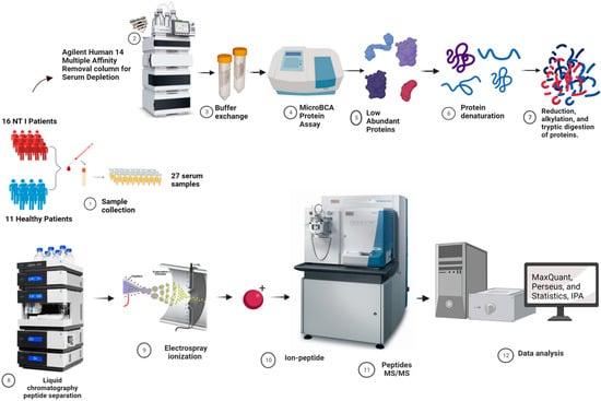 As seen in Figure 1, the experimental processes followed in this study started with the depletion of the collected serum samples. A total of 27 serum samples, consisting of 11 healthy controls and 16 NT1 samples, were subjected to depletion using Agilent Human 14 multiple affinity removal column with dimension 4.6 × 100 mm. This column depletes the 14 high-abundant proteins, namely albumin, IgA, transferrin, haptoglobin, IgG, antitrypsin, transferrin, alpha 1-acid glycoprotein, IgM, apolipoprotein AI, apolipoprotein AII, transthyretin, complement C3, and alpha 2-macroglobulin. The depletion process helps expand the dynamic range of quantitative and qualitative analysis of the low-abundant proteins that might be differentially expressed as a result of NT1 disease. Therefore, a 30 µL aliquot of serum was depleted following the protocol provided by the manufacturer. After depletion, using 5KDa MWCO 4 mL spin concentrator Agilent filter (Santa Clara, CA, USA), the buffer in the samples was exchanged with 50 mM ammonium bicarbonate (ABC) (pH 8.0) which is more compatible with Mass spectrometry, and was used for tryptic digestion.