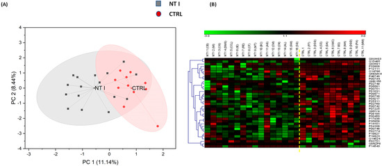 Figure 2. (A) Unsupervised Principal Component Analysis (PCA) of all identified proteins at a 95% confidence level and (B) Heatmaps for the DEPs in 16 NT1 and 11 control samples. Thirty-two DEPs are downregulated proteins in NT1, indicated by the color green, while four DEPs are upregulated, indicated by the color red.