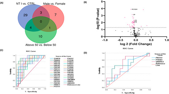 Figure 3. (A) Venn diagram of all identified low-abundant proteins in NT1 samples. Protein expression levels are compared based on sex, age, and sample source (disease and control). (B) Volcano plot of all identified low-abundant proteins in NT1, proteins with p-value < 0.05 upon Mann Whitney U-test are considered significant and are colored in magenta. DEPs are above the threshold, with downregulated DEPs on the left and upregulated DEPs on the right. Receiver operating characteristic curve (ROC-AUC) for (C) Downregulated DEPs in NT1, the AUC score of the ROC analysis is between the range of 0.80–0.91, while the p-value is between the range of 0.0001–0.04. (D) In upregulated DEPs in NT1, the AUC score of the ROC analysis is between the range of 0.60–0.70, while the p-value is between 0.0001–0.04.