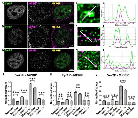 Phosphorylation of RNAPII is a tightly regulated process with a number of effects on transcription and subsequent processes [,]. Several studies have mapped the CTD phosphorylations during RNAPII activity and identified a correlation with different stages of transcription []. We observe that the nuclear MPRIP associates with the subpopulations of three phosphorylated forms of RNAPII CTD (Figure 1). These forms of RNAPII are associated with initiation (Ser5P), pause-release (Tyr1P), and elongation (Ser2P) stages of the transcription [,,]. The statistical analysis of the super-resolution microscopy images revealed that from all three phosphorylated forms of CTD, the Tyr1P-CTD had the most significant association with MPRIP (Figure 1J–L). This suggests that MPRIP might have a role during the pause-release of RNAPII that is marked by Tyr1 phosphorylation of the CTD.