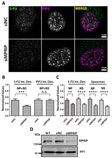 Nascent RNA labeling shows decreased transcriptional output in MPRIP depleted cells. (A) Indirect immunofluorescence experiment on U2OS cells showing the 5-FU and PIP2 labeling in control (siNC—small interfering Negative Control RNAs) and MPRIP depleted (siMPRIP—small interfering MPRIP RNAs) nuclei. Scale bars represent 5 µm. (B) The integrated densities (Int. Den.) of 5-FU and PIP2 signals in siNC and siMPRIP nuclei are normalized and represented as a column chart. (C) The Spearman’s coefficients and the integrated densities of 5-FU signals are analyzed at different PIP2-rich nuclear compartments and the normalized values are shown in the column chart. (D) The total cell extracts of Wild-Type (WT), siNC and siMPRIP were analyzed by WB to confirm the depletion of MPRIP in U2OS cells. The membranes are blotted with anti-MPRIP specific antibody and with anti-PP1 specific antibody as a loading control. n = 3. NP—Nucleoplasmic, NS—Nuclear Speckles. n.s.—Not significant. The double asterisks “**” correspond to a significance level of p ≤ 0.01, the triple asterisks “***” correspond to a significance level of p ≤ 0.001, and the quadruple asterisks “****” correspond to a significance level of p ≤ 0.0001. n = 3, 10 cells/condition.