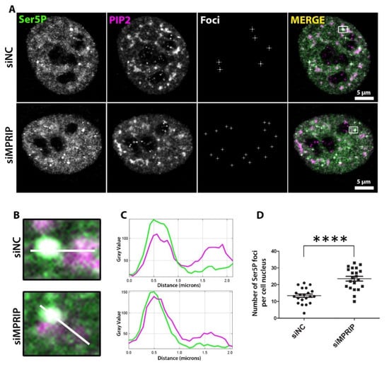 The number of Ser5P-CTD foci increase upon MPRIP depletion in cell nuclei. (A) Immunofluorescence labeling experiment on U2OS cells showing the Ser5P-CTD foci in control (siNC—small interfering Negative Control RNAs) and MPRIP-depleted (siMPRIP—small interfering MPRIP RNAs) nuclei. Scale bars represent 5 µm. (B) Zoomed views of foci that are marked by a white rectangle in the “Merge” images. The white lines on the zoomed views represent the regions for the intensity plots on (C) where the upper plot corresponds to the intensities of siNC and lower, to siMPRIP. (D) The dot plot shows the number of Ser5P-CTD foci per cell nucleus of siNC and siMPRIP. The quadruple asterisks “****” correspond to a significance level of p ≤ 0.0001. n = 3.