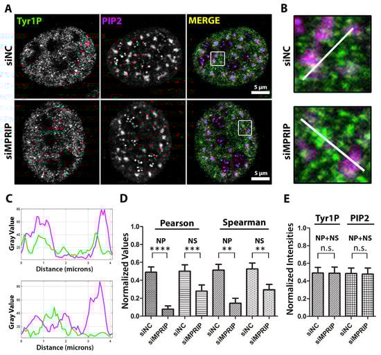 MPRIP depletion leads to the decreased association of Tyr1 phosphorylated RNAPII to PIP2. (A) The immunofluorescence experiment visualized by a confocal microscope shows the mutual distribution of PIP2 and Tyr1P-CTD in control and MPRIP depleted U2OS nucleus. Scale bars represent 5 µm. (B) Zoomed views of the regions that are marked by a white rectangle in the “merge” images. The white lines on the zoomed views represent the regions of the intensity plots (C) where the upper plot corresponds to the intensities of siNC and the lower, to siMPRIP. (D) The column chart shows normalized values of Spearman’s and Pearson’s coefficients that are observed in different PIP2-rich nuclear compartments. (E) The integrated densities of Tyr1P-CTD and PIP2 signals are normalized and represented as a column chart in control (siNC—small interfering Negative Control RNAs) and MPRIP depleted (siMPRIP—small interfering MPRIP RNAs) conditions. NP—Nucleoplasmic, NS—Nuclear Speckles. n.s.—Not significant. The double asterisks “**” correspond to a significance level of p ≤ 0.01, the triple asterisks “***” correspond to a significance level of p ≤ 0.001, and the quadruple asterisks “****” correspond to a significance level of p ≤ 0.0001. n = 2, 10 cells/condition.