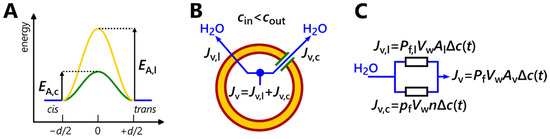 (A) The activation energy of transmembrane water transport through water-conducting channels, EA,c, is lower than that of non-facilitated permeation through the lipid bilayer, EA,l. EA,c is related to unitary channel permeability, pf, whereby pf ∝ exp(−EA/RT) [8,9]. (B) In stopped-flow water flux measurements, lipid vesicles are exposed to hyperosmotic conditions by increasing external osmolarity, cout. Consequently, water exits the vesicle, whereby the volume flux of water, Jv, is assessed by measuring the rate of change of intravesicular volume, dV(t)/dt. Since V changes with time, so does internal osmolarity, cin(t), and thus, the osmotic gradient Δc(t) = cin(t) − cout. Water can either traverse the lipid bilayer, Jv,l, or permeate through membrane-embedded water-conducting channels, Jv,c, as indicated by the blue arrows. Since both pathways are available independently, Jv = Jv,l + Jv,c. (C) An equivalent circuit may illustrate the same: the resistances of the lipid bilayer (1/Pf,l) and that of n channels (1/Pf,c) add up, as detailed in Section 2.1. Jv,l depends on the vesicle surface area covered by lipids, Al, over which water can permeate. Here, we consider experiments in which the area fraction covered by channels is negligible, i.e., the surface area of the vesicle Av is not significantly different from Al.