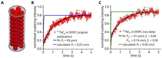 For the published plot of F12NC4 channels in DOPC (dioleoyl phosphatidylcholine) vesicles, we find Pf = 69 µm/s (Figure 5B, black line). This value corresponds to the permeability of a bare DOPC lipid bilayer [23,24], and hence, Pf = Pf,l. It follows that Pf,c = 0 (or Pf,c << Pf,l), which agrees with the observation that the time course of scattered light intensity shown in ref. [10] for bare DOPC liposomes is practically identical to that in the presence of F12NC4. If Pf,c was equal to 0.25 cm/s, as claimed in [10], we would expect the measured scattering trace (Figure 5B, red points) to resemble the blue trace in Figure 5B—yet, there is no resemblance.