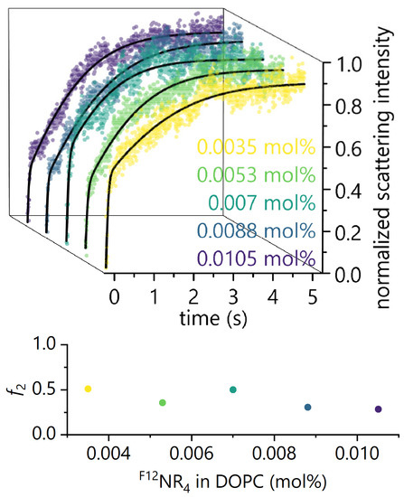 A more realistic scenario that could explain the experimental data is illustrated in Figure 2C. It specifies that only a fraction of vesicles may contain F12NC4 channels. Since channel-containing and empty liposomes deflate at different rates, the scattering trace obtained from the inhomogeneous vesicle ensemble will exhibit two distinct kinetics. Unfortunately, the experimental data presented by Itoh et al. [10] render the applicability of this scenario in their experiments unwarranted. It would require (a) independent proof that only ≈1/3 of the vesicles contain the functionally-assembled channel and/or (b) deflation experiments where the functional channel is present in most vesicles. Yet, Itoh et al. indicated that on average, about 1.9 channels should be active per vesicle for the experiment shown in Figure 5. We calculated that number from the mentioned % mol fraction of 0.0053 F12NR4, the number of 3.5 × 105 lipids per vesicle, and the involvement of 10 F12NR4 molecules per channel. We computed the number of lipids from the vesicle diameter of 200 nm, a lipid area of 0.72 nm2 [25], and the presence of 2 leaflets per vesicle. The data leave no room for empty vesicles, thereby ruling out (a). Furthermore, Itoh et al. provided experimental data in which they gradually increased the concentration of F12NR4. Yet, the fraction with fast kinetic, f2, did not increase, rendering option (b) obsolete as well (Figure 6).