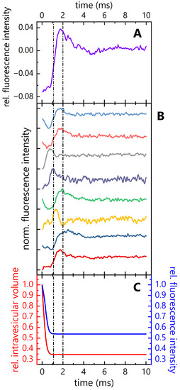 A comparison between fluorescence intensity traces obtained in stopped-flow self-quenching experiments on DPPC liposomes comprising 0.0018 mol% F12NR4 nanorings [10] and calculated data based on the reported permeability of F12NC4 in DPPC. (A) Shown is the exemplary trace published as Figure 3B in ref. [10] in its entirety. Data evaluation is not possible during the dead time of the stopped-flow instrument, which Itoh et al. [10] specified as 1.1 ms—illustrated by the first dash-dotted vertical line. In contrast to the expected decrease, fluorescence intensity after 1.1 ms is still increasing. Yet, the authors chose to display the exemplary trace only starting from 2 ms (illustrated by the second dash-dotted line), where it shows the expected decline in fluorescence intensity. (B) The constituent traces from which Itoh et al. generated the exemplary trace by averaging and subsequent normalization. The displayed curves are normalized to the interval [0, 1]. After 1.1 ms, most traces are still climbing; even after 2 ms, the individual traces do not behave uniformly. (C) The time course of intravesicular volume was calculated using Equation (9) and is plotted as relative volume over time (red trace). The following parameters were used for calculation: c0 = 210 mM, cout = 610 mM (as published and assuming an osmotic coefficient of 1), Pf = 0.2 cm/s (read from Figure 3C in Itoh et al.), r0 = 23.6 nm (read from the communicated raw data). To allow for comparison with panels A and B, relative intravesicular volume was transformed into relative fluorescence intensity as described by Itoh et al. [10] in a document accompanying the communicated raw data (blue trace). Since the authors chose to use the impractically low initial intravesicular carboxyfluorescein concentration of 0.5 mM, the transformation between fluorescence intensity and volume is not linear. The abscissa is identical in each panel.