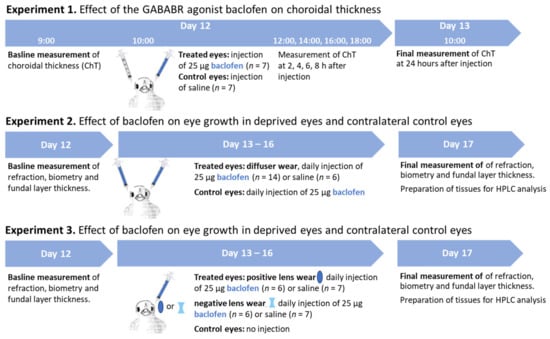 There are several limitations in our study. Firstly, we only tested the influence of a GABABR agonist. Additional studies on the effect of GABABR antagonists on dopamine metabolism and choroidal thickness changes are intended, because the antagonists tested so far seem to be more potent in reducing the accelerated eye growth during myopia development and could therefore be interesting as potential drugs for myopia control. Secondly, we did not test different concentrations of baclofen. It was shown that high doses of the GABABR agonist baclofen—after intraperitoneal injection—activated GABAAR as well [73]. However, since a previous study demonstrated that eye growth in chicks injected with 10 µg or 100 µg baclofen were different from those injected with a GABAAR agonist [21], we believe that the dosage of 25 µg in our study was not too high and that the measured effects were specific for GABABR action. Lastly, in the study described here, the same amount of baclofen (25 µg) was injected in all experiments, but the volume in which the drug was dissolved was varied (25 µL in Exp. 1 and Exp. 2 versus 12.5 µL in Exp. 3). The resulting difference in baclofen concentration could have affected the pharmacokinetics, i.e., the time required for baclofen to bind to the receptor, as well as the binding specificity. Since the results of the different ametropia models (DM, LIM, LIH) were analyzed separately and were compared to the matched control groups, we nevertheless think that our conclusion was not affected by this difference in experimental design.