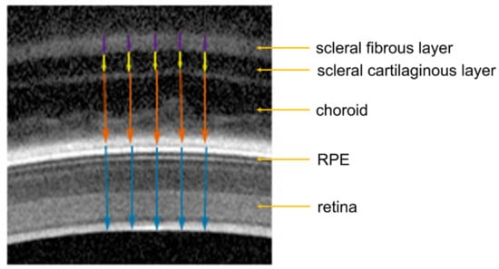 Illustration of how the chicken retinal, choroidal and scleral thickness were determined in OCT images. Blue arrows: retinal thickness; orange arrows: choroidal thickness; yellow arrows: scleral cartilaginous layer thickness; purple arrows: scleral fibrous layer thickness. RPE: retinal pigment epithelium.