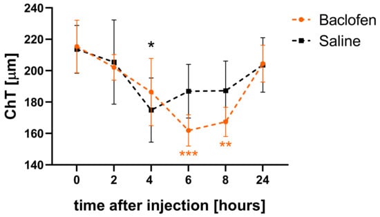Influence of intravitreal baclofen injections on ChT changes. ChT in baclofen-injected eyes decreased significantly after 6 and 8 h compared to baseline, then recovered to baseline level after 24 h. ChT in the fellow eyes injected with saline decreased as well and reached the minimal thickness at 4 h after injection and started to recover earlier. Data are shown as mean ± SEM. Two-way repeated measures ANOVA with Dunnett’s multiple comparisons test: *: p < 0.05; **: p < 0.01; ***: p < 0.001.