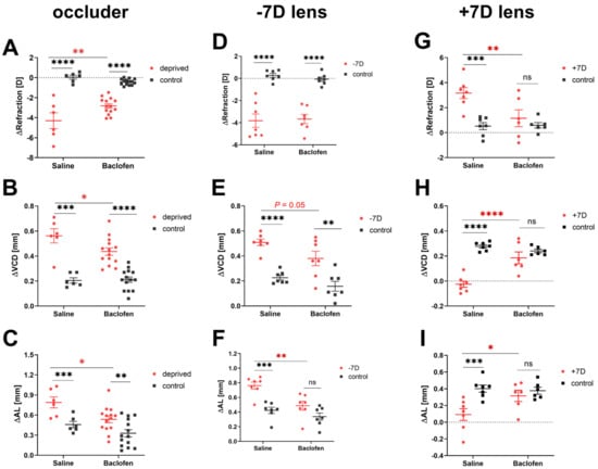 3.2. Baclofen Attenuates the Effects of Deprivation and Defocus on Eye Growth