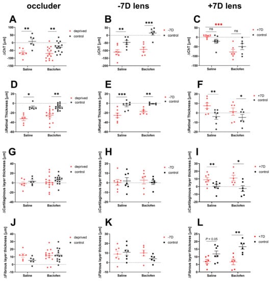 While the positive lens-treated eyes in the saline group showed a tendency to have thicker choroids than their contralateral eyes (+7D saline vs. fellow: 4.71 ± 4 µm vs. −21.53 ± 11.2 µm, p = 0.07), those in the baclofen group responded in the opposite way (+7D baclofen vs. fellow: −78.19 ± 14.10 µm vs. −49.60 µm ± 16.02 µm, p = 0.07). The effect of baclofen on choroidal thickness in +7D lens-wearing eyes was thus very different from that in eyes treated with saline and positive lenses (+7D lens: saline vs. baclofen: 4.71 ± 4 µm vs. −78.19 ± 14.10 µm, p = 0.0002, Figure 5C). In contrast, retinal thickness increased with positive lens treatment in both baclofen- and saline-injected +7D-lens treated eyes (+7D vs. fellow: saline: 7.54 ± 2.86 µm vs. −3.83 ± 2.96 µm, p = 0.003; baclofen: 1.34 ± 3.87 µm vs. −4.75 ± 3,17 µm, p = 0.01, Figure 5F). When myopia was induced with diffusers or negative lenses, both the choroid and retina became significantly thinner in experimental eyes than in fellow eyes (Figure 5A,B,D,E); baclofen injections had no additional effect. We also did not detect any effect of baclofen on scleral thickness. There was also no significant difference in the cartilage or fiber layer thickness between the experimental and fellow eyes in either the DM (Figure 5G,J) or LIM (Figure 5H,K) groups. The eyes that wore a positive lens had a thicker cartilage sclera than the fellow eyes (+7D vs. no lens: saline group: 8.95 ± 2.85 µm vs. 0.42 ± 2.43 µm, p = 0.004; baclofen group: 11.20 ± 3.62 µm vs. −2.56 ± 3.73 µm, p = 0.02, Figure 5I) and a significant thinner fibrous layer (+7D vs fellow: saline group: 6.89 ± 1.37 µm vs. 11.88 ± 1.92 µm, p = 0.05; baclofen group: 6.60 ± 1.79 µm vs 16.64 ± 1.68 µm, p = 0.02, Figure 5L).