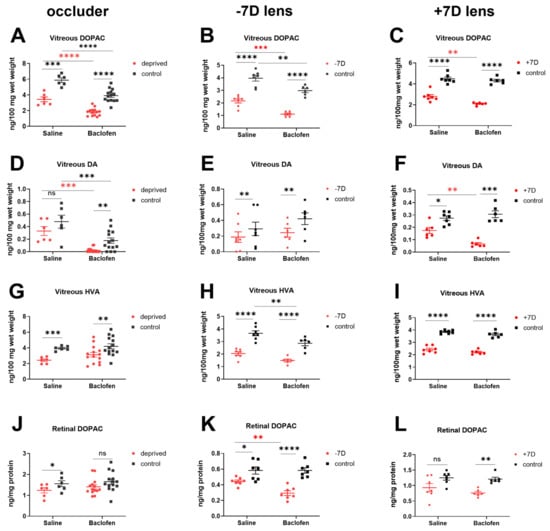 Dopamine and dopamine metabolite content. Control eyes of DM chicks received baclofen or saline injections, while those of LIM or LIH chicks were not injected at all. Baclofen significantly decreased the amount of vitreal DOPAC in all the baclofen-injected eyes (A–C), as well as vitreal dopamine level in deprived (D) and positive lens-treated eyes (F), but not in in negative lens-treated eyes (E). The level of vitreal HVA (H) and retinal DOPAC (K) in LIM eyes were reduced via baclofen, while there was no significant difference in deprived (G,J) and positive lens-treated eyes (I,L). Data show the mean ± SEM. Difference between two groups were analyzed with two-way mixed ANOVA with Sidak’s post hoc test. Binocular differences were analyzed with paired t-test. ns: not significant; *: p < 0.05; **: p < 0.01; ***: p < 0.001; ****: p < 0.0001.