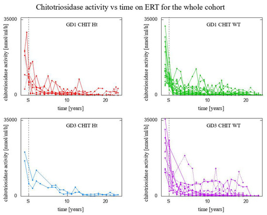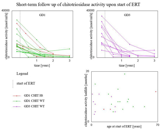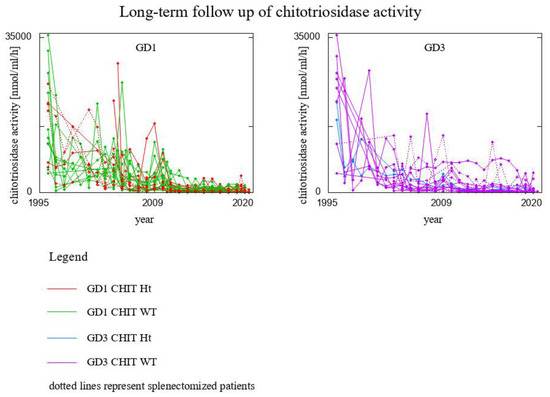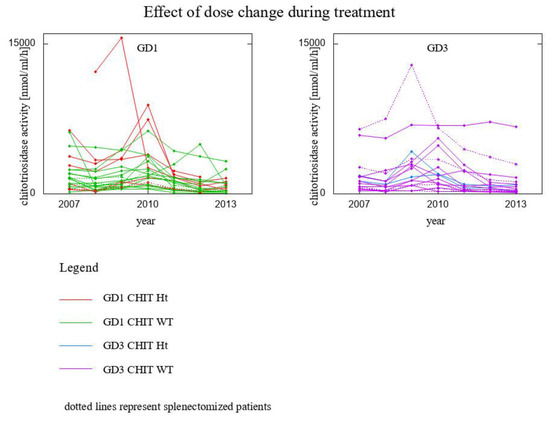 Chitotriosidase activity has been shown to correlate with several clinical parameters of GD as well as to decline in response to treatment. Chitotriosidase was the first biomarker used in GD. However, apart from a 17-year-long observation of chitotriosidase in 55 GD type 1 Romanian patients presented by Drugan et al. in 2017 [16], the literature is lacking in such a longitudinal study, with the additional feature of captured effect of dose change during the ERT treatment.