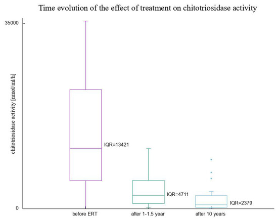 Next, in order to answer the question of whether the response to ERT is of an immediate or rather gradual nature, we compared the data of chitotriosidase level before the start of ERT, one year (12 to 18 months after the first administration of ERT), and ten years afterwards. Two figures visualize the decrease in chitotriosidase activity—a box-and-whisker plot with non-normalized, raw data (Figure 3), and a three-point time-trajectory with the level of chitotriosidase activity normalized to chitotriosidase level measured before the start of treatment (Figure 4). These two plots show the results for 38 patients: