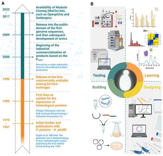 Timeline of achievements for K. phaffii biotechnology during the last fifty-five years (A) and the principal steps (e.g., designing, building, testing, and learning) plus the main technologies for recombinant protein production (e.g., protein purification, and characterization systems) (B).