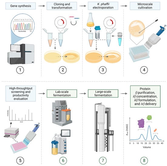 General workflow for the production of heterologous proteins and their industrial manufacture with K. phaffii. The main steps are (1) gene synthesis; (2) cloning and transformation using E. coli; (3) K. phaffii electroporation after the verification of the generated construct in the plasmid; (4) microscale cultivation of the colonies in 96-deep-well plates picked from the selective (e.g., antibiotic, or heterotrophic compensation) agar plates; (5) high-throughput screening and evaluation of the productivity (e.g., colorimetric assay, and LabChip® GXII Touch™ protein characterization system); (6) laboratory-scale fermentation (e.g., 3 L, 5 L, and 10 L); (7) large-scale fermentation; (8) final steps: protein (i) purification, (ii) concentration, (iii) formulation, and (iv) delivery. The light blue or green colour of the rectangular-shape text field indicates upstream (light blue) or downstream (green) part.