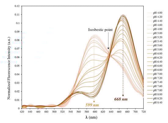 The fluorescence of the probe in the cell culture medium was examined using an excitation light at 514 nm provided by an Argon ion-laser and the fluorescence emission was recorded in the 420–720 nm range. As shown in Figure 1, when excited at 514 nm, SNARF-4F exhibits a pH-dependent wavelength shift with emission maxima at 599 nm and 668 nm, and an isosbestic point at 638 nm. In parallel, looking at Figure 3, the probe displayed a strong deep red fluorescence in neutral/basic medium ( = 668 nm). In contrast, when the pH of the medium was down-regulated to more acidic values, the fluorescence gradually changed from deep red to yellow-orange ( = 559 nm). Thus, increasing acidity was accompanied by yellow-shifts for emission spectra when the pH changed from neutral to acidic.