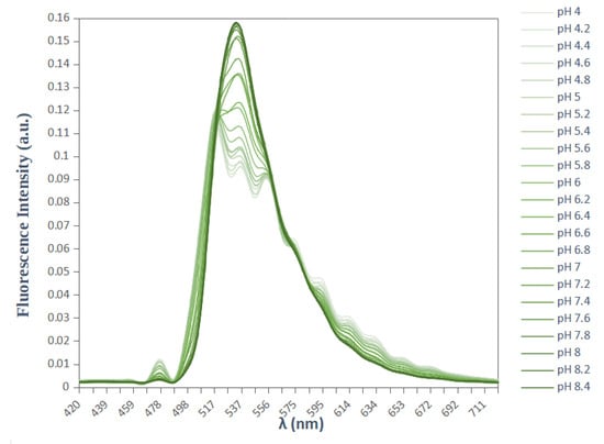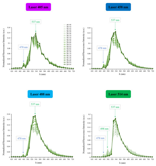 The analysis of the emission spectra shows that the longer excitation wavelength gives the higher fluorescence intensities in all emission wavelengths we explored (420–720 nm). Namely, 514 nm produced the highest fluorescence values. Whatever the excitation wavelength, the fluorescence intensity of the probe is maximum when the emission wavelength is around 537 nm. Another emission wavelength with smaller fluorescence intensity, but common to all spectra, is noticed at 478 nm (blue arrow). The fluorescence intensities around 478 nm decrease when the pH increases, while those of around 537 nm increase at the same conditions. Only for the 514 nm laser, a third emission wavelength is noticed at 498 nm and responds to the pH changes similarly to 478 nm (green arrow).