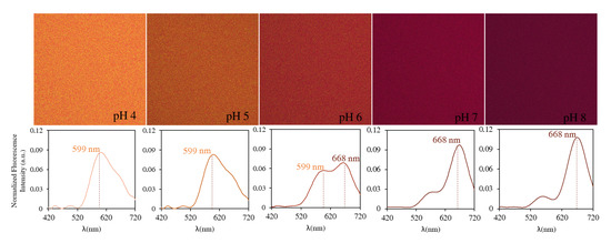Fluorescence images of SNARF-4F in DMEM medium from pH 4.0 (left) to pH 8.00 (right) under 514 nm excitation. For each pH, we present the average emission spectrum over the entire image (2048 × 2048 pixels).