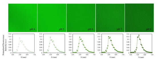 Fluorescence images of BCECF in DMEM medium from pH 4.0 (left) to pH 8.00 (right) under 405 nm excitation. For each pH, we present the average emission spectrum over the entire image (2048 × 2048 pixels).