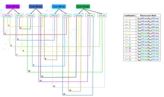 As its name suggests, the ratiometric method is based on the use of a ratio between two fluorescence intensities measured at two emission wavelengths. A relationship between the pH and this ratio is therefore established. Starting from this principle, we measured the ratio between all the combinations of minor (478 nm and 498 nm) with major (537 nm) fluorescence emission intensities between the four different emission spectra of BCECF (Figure 6). The goal was to find a combination of two emission wavelengths allowing to detect the pH as a function of the fluorescence ratio. As the BCECF is used as a dual excitation probe, the two emission wavelengths are chosen separately from two different laser lines. In total, 15 combinations were made between the emission wavelengths. These combinations are shown in Figure 7. Every combination shows first the two laser lines used and therefore the emission wavelength chosen for each. For example the combination 1 (in yellow) shows that the two lasers used are 405 nm and 458 nm. For the 405 nm laser the emission wavelength is fixed at 478 nm while for the 458 nm laser the emission wavelength is fixed at 537 nm.