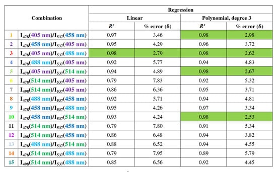 The coefficient of determination R and the percent error for each regression applied on the data points of each laser combination. In green, the 4 best combinations with a coefficient of determination R of 0.98 and a percent error smaller than 3%.