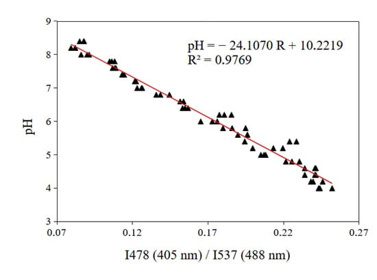 Calibration curve obtained from the best combination of the two lasers (405 nm and 488 nm) for BCECF. The emission wavelength was fixed at 478 nm for the 405 nm laser and at 537 nm for the 488 nm laser (data set in triplicate).