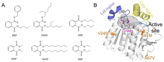 The 2D structures of six common PAEs and the 3D structure of EstJ6. (A) The 2D structures of six common PAEs including BBP, DEHP, DBP, DMP, DnOP, and DEP. (B) Overview of EstJ6 stereo structure and mutation sites for ET2.2. Magenta sticks represent triads S146, E240, and H270. Essential motifs including lid and cap regions are colored purple and yellow, respectively. The substrate binding pocket is highlighted by an oval.