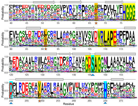 Both sequence alignment and co-evolution analysis were performed to recognize highly conservative residues along with the residue–residue coupling information of EstJ6. The alignment result involving high similarity sequences shown in Figure S1 unveils some crucial conservative residues in EstJ6, such as the oxyanion hole residues 75-HGGG-80, conservative helical region 143-GXSXG-149 [38], and catalytic triads (S146, E240, and H270) [18], which play essential roles in ligand binding and catalytic process for family IV of hydrolyses. We then employed WebLogo 3 [39] to perform a sequence logo generation based on a multiple sequence comparison of EstJ6, which was obtained from Ev-coupling to investigate the residue conservativeness, and the results are shown in Figure 2 and Figure S2. Not surprisingly, residues of the mentioned two crucial motifs and catalytic triads had a high frequency (Figure 2 and Figure S2 and Table S1). For example, the first X in the GXSXG conserved motif was customarily composed of acid residues, such as glutamate (11.25%) and aspartate (62.27%). As for the second X, its frequency of alanine was 82.75%. The occurrence probability of residue 240 for acidic residues in the catalytic triads, including glutamate and aspartate, was 23.88% and 74.13%, respectively. During the hydrolysis process, the position determination of H270 was assisted by E240 via a hydrogen-bond interaction [18,40]. Noteworthy, E240 and H270 belong to coupling evolutionary residue pairs according to the Ev-coupling analysis. As for the three mutational sites, all of them had a low occurrence frequency during the evolution process (Figure 2 and Table S1).