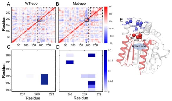 The residue–residue correlation information of the entire protein and the contact information of the pocket entrance regions in the two apo systems. (A,B) Dynamical cross-correlation maps for the Cα atom pairs according to the last 100-ns MD trajectories: WT-apo (A) and Mut-apo (B). Areas with strong variations between apo systems are emphasized with black boxes. (C,D) The contact map between the lid region and residues 265–272: WT-apo (C) and Mut-apo (D). (E) The overall structure of EstJ6. The pocket entrance residues are indicated by blue and red spheres, and residues 200–297 are depicted in red.