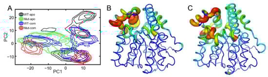 Next, to depict the conformational discrepancies of EstJ6 upon DBP binding and mutations, a principal component analysis (PCA) was performed for the last 100-ns MD trajectories of all the systems considering three replicates together. The results are displayed in the free-energy surface using the first two principal components (called PC1 and PC2). As illustrated in Figure 5A, all systems exhibited decentralized or broad conformational sampling, indicating that systems from three independent replicates were not trapped in a particularly long-lived metastable state. The structure of the WT-apo was mainly distributed along PC1, while the others were along PC2. To intuitively recognize the global motions captured by PC1 and PC2, the residue displacements were mapped onto the protein structure (Figure 5B,C), and the conformational motions along PC1 and PC2 are also shown in Supplementary Videos S1 and S2.