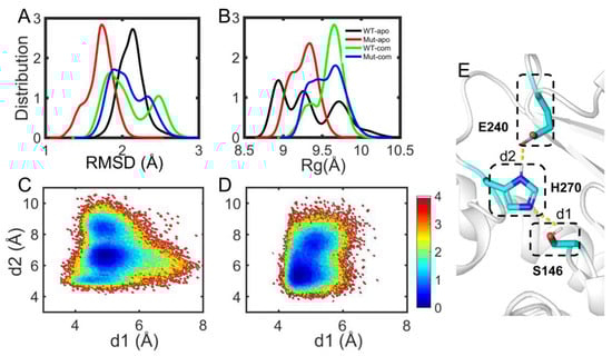 Substrate binding pocket analyses. The distribution of RMSD (A) and Rg (B) of hydrophobic residues in the binding site. The free energy landscape distribution of the side-chain distances of the catalytic triad including S146-H270 (d1) and E240-H270 (d2) with lower energy minima basins colored in deep blue for WT-com (C) and Mut-com (D). (E) The local structure and hydrogen-bond network of the active site involving the catalytic triads.