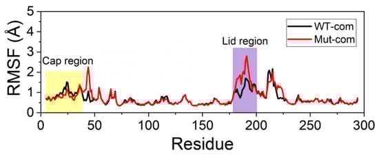In order to further investigate the flexibility of individual residues, the analysis of root-mean-square fluctuations of Cα atoms (Cα RMSFs) for the last 100-ns simulations was performed (Figure 3A). The lid (residues 182–199) over the active site exhibits the highest RMSF values in all the systems. Our results suggest that ligand binding makes the lid more rigid, while mutations result in a more flexible lid region. The subsequent peak in WT-apo involved residues G211-S216 and was reduced in other systems, which might be advantageous to maintain the stability of the hydrophobic pocket. In order to intuitively observe how the changes caused by mutations in RMSF are distributed spatially, we mapped the RMSF differences between the two apo systems onto the protein structure (Figure 3B). A significant increase in the flexibility of the lid region could be easily observed. In addition, the first helix of the cap region and a loop close to the entrance of the ligand binding pocket also became slightly more flexible in Mut-apo, while regions deeper in the pocket were found with moderately enhanced rigidification.