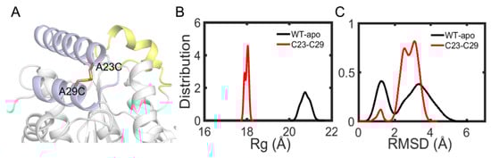 Structure and dynamics information of mutants. (A) The mutation sites A23C and A29C are depicted in sticks. (B) The distribution plot of Rg for the overall structure including wild type and mutantA23C-A29C. (C) The RMSD distribution plot of the cap region for wild type and mutantA23C-A29C.
