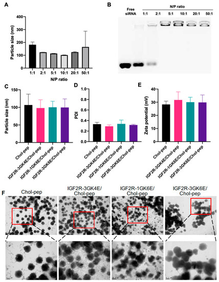 Characterization of the nanocomplex. (A) Particle size and (B) gel retardation assay of the cholesteryl peptide nanocomplexes at different N/P ratios. (C) Particle size, (D) PDI, (E) Zeta potential, (F) TEM images of the dimeric IGF2R peptide-modified nanocomplexes.