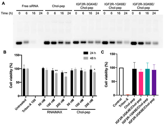 Serum stability and cytotoxicity of the nanocomplex. (A) Serum stability of siRNA nanocomplexes in 50% rat serum for 0, 6, 12, and 24 h. (B) Cytotoxicity of the cholesteryl peptide nanocomplexes and Lipofectamine™ RNAiMAX at 50, 100, 200 nM siRNA. (C) Cytotoxicity of the IGF2R peptide-modified nanocomplexes at 100 nM siRNA. Results are presented as the mean ± SD (n = 3) (* p < 0.05; ** p < 0.01).