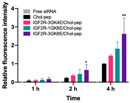 Quantitative cellular uptake of IGF2R peptide-modified nanocomplex in HSC-T6 cells. The cells were incubated with a nanocomplex loaded with Cy5-labeled Pcbp2 siRNA for 1, 2, and 4 h, followed by flow cytometry analysis. Results are presented as the mean ± SD (n = 3) (* p < 0.05; ** p < 0.01).