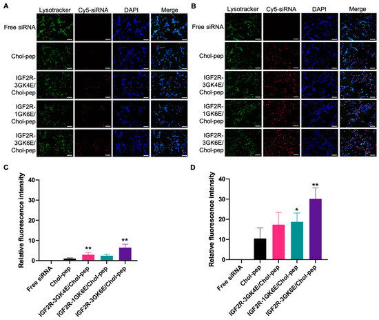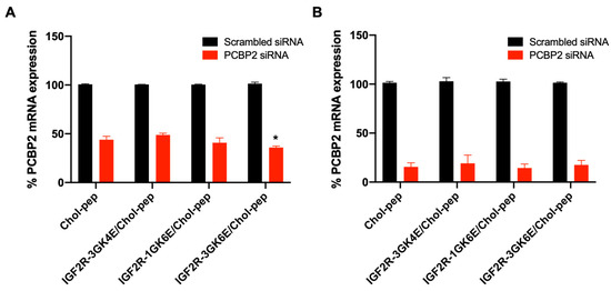 The cholesteryl peptide/Pcbp2 siRNA nanocomplex efficiently silenced approximately 80–85% of Pcbp2 mRNA expression in activated HSC-T6 cells after transfection for 24 h (Figure 6B). This demonstrated excellent silencing activities, which is consistent with the literature on cholesteryl peptide-based nanocomplexes applied in different cell lines [16,17,18]. Based on the cellular uptake results (Figure 4 and Figure 5), the silencing activity of the nanocomplex was further evaluated for 4-h transfection in activated HSC-T6 cells. The IGF2R-3GK6E peptide-modified nanocomplex demonstrated a higher silencing activity in activated HSC-T6 cells compared to the bare nanocomplex, indicating that the IGF2R peptide facilitated specific targeting and uptake of the nanocomplex (Figure 6A).