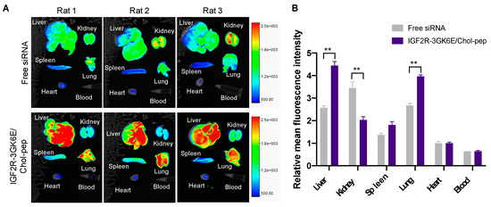In accordance with the literature, the cholesteryl peptide delivery system showed the potent silencing activity of Pcbp2 siRNA in HSC-T6 cells (Figure 6). As reported in the cellular uptake study, a nanocomplex modified with IGF2R-3GK6E peptide ligand significantly downregulated mRNA expression of the Pcbp2 gene after 4 h of incubation compared to the bare nanocomplex, indicating a high transfection efficiency. This result was attributed to the overexpression of IGF2R on the cell membrane of activated HSC-T6 cells. The upregulated expression of IGF2R facilitated approximately three times the endocytosis and mediated intracellular transportation [33]. Therefore, the in vitro cellular uptake and silencing activity studies suggest that IGF2R-3GK6E peptide-modified nanocomplex can increase HSCs-specific targeting and siRNA delivery efficiency of the nanocomplex. An in vivo biodistribution study was performed in a rat model with CCl4-induced liver fibrosis to evaluate the uptake of IGF2R peptide-modified nanocomplex in the fibrotic liver (Figure 7). Nanoparticles with positively charged surfaces tend to accumulate in the liver, lung, and spleen [34]. Chol-pep nanocomplex effectively prevented the siRNA from nuclease degradation during blood circulation [17]. In accordance with the literature [13,14], the IGF2R-3GK6E peptide-modified nanocomplex demonstrated a significant uptake in the liver, prolonged the half-life of siRNA, and reduced renal clearance, making it a promising siRNA delivery system for the treatment of liver fibrosis.
