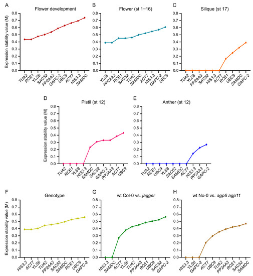 Expression stability values (M) of the ten candidate reference genes calculated by geNorm in the RefFinder software. (A) M values of the ten candidate reference genes in the flower development group which included 21 samples corresponding to flower (st 1–16), silique (st 17), pistil (st 12), and anther (st 12) samples. (B) M values of the ten candidate reference genes in 12 flower (st 1–16) samples which included flower st 1–6, flower st 7–12, flower st 13–14, and flower st 15–16 samples. (C) M values of the ten candidate reference genes in the three silique (st 17) samples. (D) M values of the ten candidate reference genes in the three pistil (st 12) samples. (E) M values of the ten candidate reference genes in the three anther (st 12) samples. (F) M values of the ten candidate reference genes in the genotype set that comprised 12 samples corresponding to wt Col-0, jagger, wt No-0 and agp6 agp11 samples. (G) M values of the ten candidate reference genes in six wt Col-0 vs. jagger samples that included three wt Col-0 and three jagger samples. (H) M values of the ten candidate reference genes in six wt No-0 vs. agp6 agp11 samples which included three wt No-0 and three agp6 agp11 samples. The genes are arranged from the most to the least stable gene (from left to right). Abbreviations: Col-0, Columbia-0; No-0, Nossen-0; st, stage; wt, wild-type.