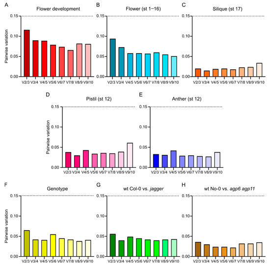 Pairwise variation (Vn/Vn+1) of the ten candidate reference genes using geNorm. (A) Pairwise variation values of the ten candidate reference genes in the flower development group which included 21 samples corresponding to flower (st 1–16), silique (st 17), pistil (st 12), and anther (st 12) samples. (B) Pairwise variation values of the ten candidate reference genes in 12 flower (st 1–16) samples which included flower st 1–6, flower st 7–12, flower st 13–14, and flower st 15–16 samples. (C) Pairwise variation values of the ten candidate reference genes in the three silique (st 17) samples. (D) Pairwise variation values of the ten candidate reference genes in the three pistil (st 12) samples. (E) Pairwise variation values of the ten candidate reference genes in the three anther (st 12) samples. (F) Pairwise variation values of the ten candidate reference genes in the genotype set that comprised 12 samples corresponding to wt Col-0, jagger, wt No-0 and agp6 agp11 samples. (G) Pairwise variation values of the ten candidate reference genes in six wt Col-0 vs. jagger samples that included three wt Col-0 and three jagger samples. (H) Pairwise variation values of the ten candidate reference genes in six wt No-0 vs. agp6 agp11 samples which included three wt No-0 and three agp6 agp11 samples. The pointed line represents the cut-off value of 0.15. Abbreviations: Col-0, Columbia-0; No-0, Nossen-0; st, stage; wt, wild-type.
